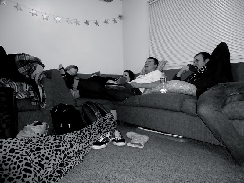 . standing in the back of the boys dorm {at my other old housing complex} even though it was past curfew because it was freezing cold. we "welcome home"d all the boys until someone showed up without pants on... that was awkward.